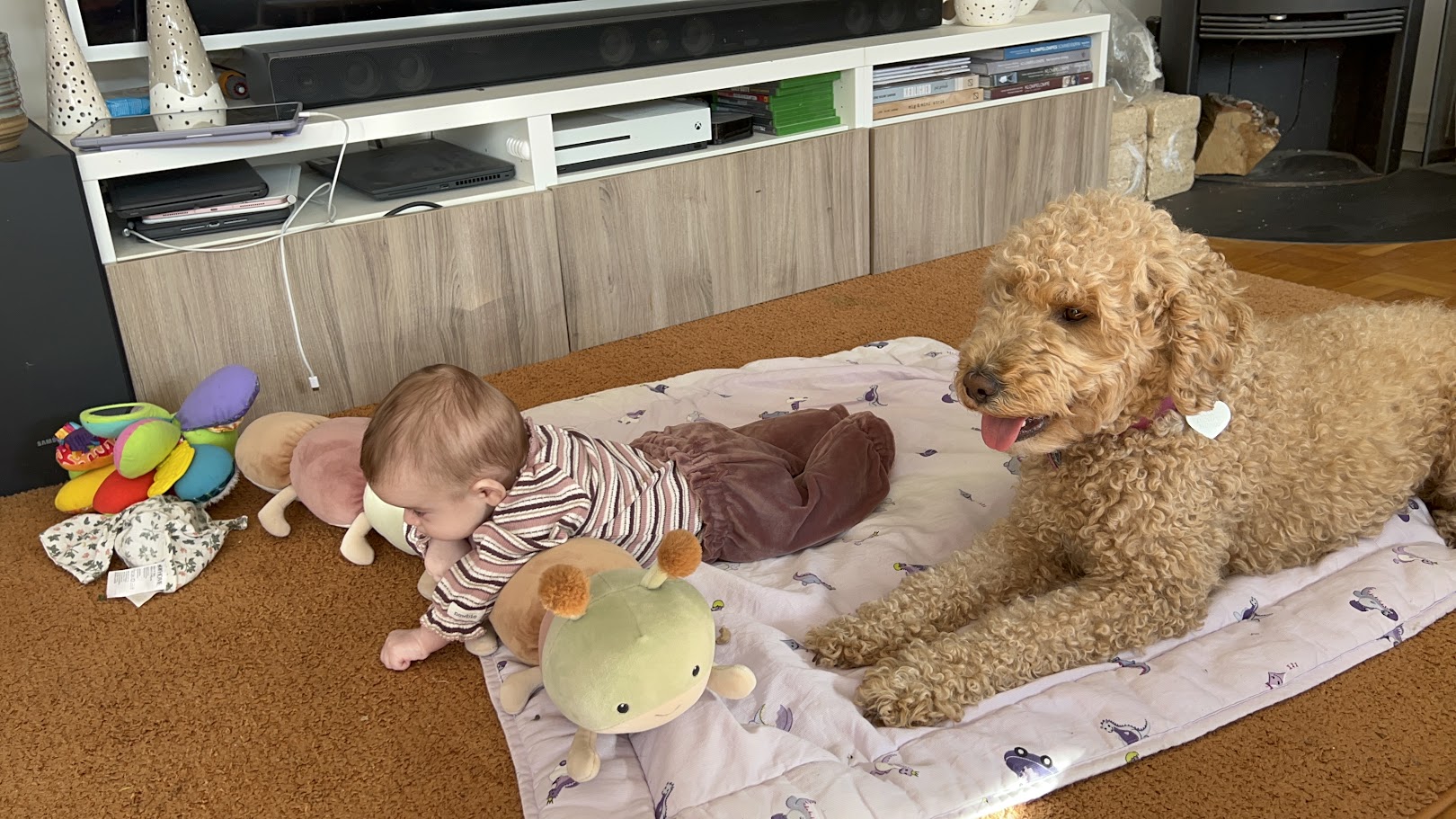 Vores piger på 10 og 13 år, er med til at opdrage og passe. Det giver en god dynamik i familien og flokken. Vi har lige fået en datter mere på nu 1 år. Hende bliver der passet godt på, også af hundene.